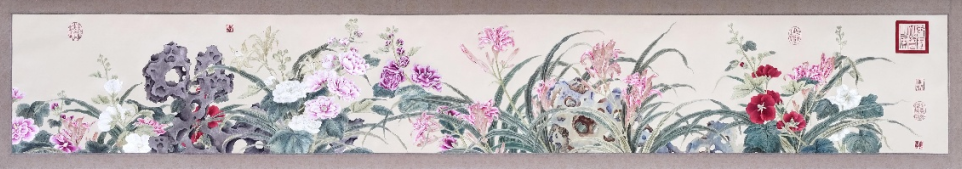 “刚进厂的时候,我只是机绣车间的一名普通工人,后来因为工作成绩突出,厂里面把我提拔到生产技术科,工作几年后,我又从汴绣厂调到工艺美术研究所工作。为了更好地提高技艺水平,我开始学习绘画设计,得到中国工艺美术大师、著名花鸟画画家王少卿老师的指导,又随省工艺美术大师王金萍老师学习手工刺绣。”韩玉琴回忆道,“那时候我白天要忙于单位的行政工作,只能在节假日的时候向老师学习汴绣针法。王金萍老师是一位德艺双馨的匠人,不仅技术出众而且淡泊名利,在业内有着很高的威望。我从最基础的针法学起,老师绣一针,我就跟着练几十针、上百针,直到针脚与老师分毫不差。晚上我还要在昏暗的灯下钻研针法图谱,对照宋画揣摩配色与运针的技巧。学习的过程非常艰苦,但我从来没觉得累,我觉得只要日积月累、勤奋不辍,就一定能把手艺学精、学透。在老师的悉心传授和自身的努力下,我很快掌握了齐针、套针、蒙针、滚针、缠针、打籽针、接针等36种针法,绣制了荷花、宣花等一系列作品,继承了宋代古朴、典雅、细腻的艺术特色,练就出‘针脚细如发丝,色彩过渡无痕’的过硬功底。”